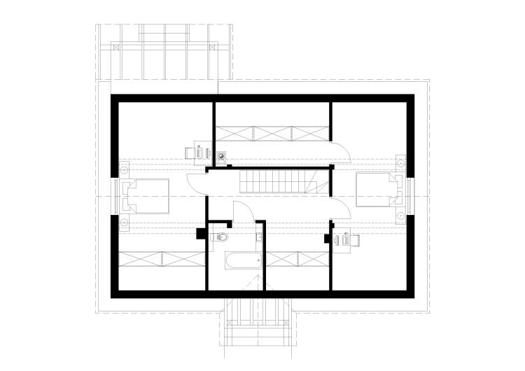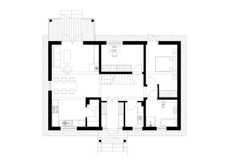 Rzut parteru składa się z otwartego wejścia z szerokim korytarzem. Po lewej stronie znajduje się przytulna część wypoczynkowa z wyjściem na taras z którego rozpościera się nieziemski widok na las. Po prawej strony budynku znajduje się natomiast część nocna. W tym małym domku o około 77 m² powierzchni w parterze udało się jeszcze wygospodarować około 33 m² poddasza użytkowego.