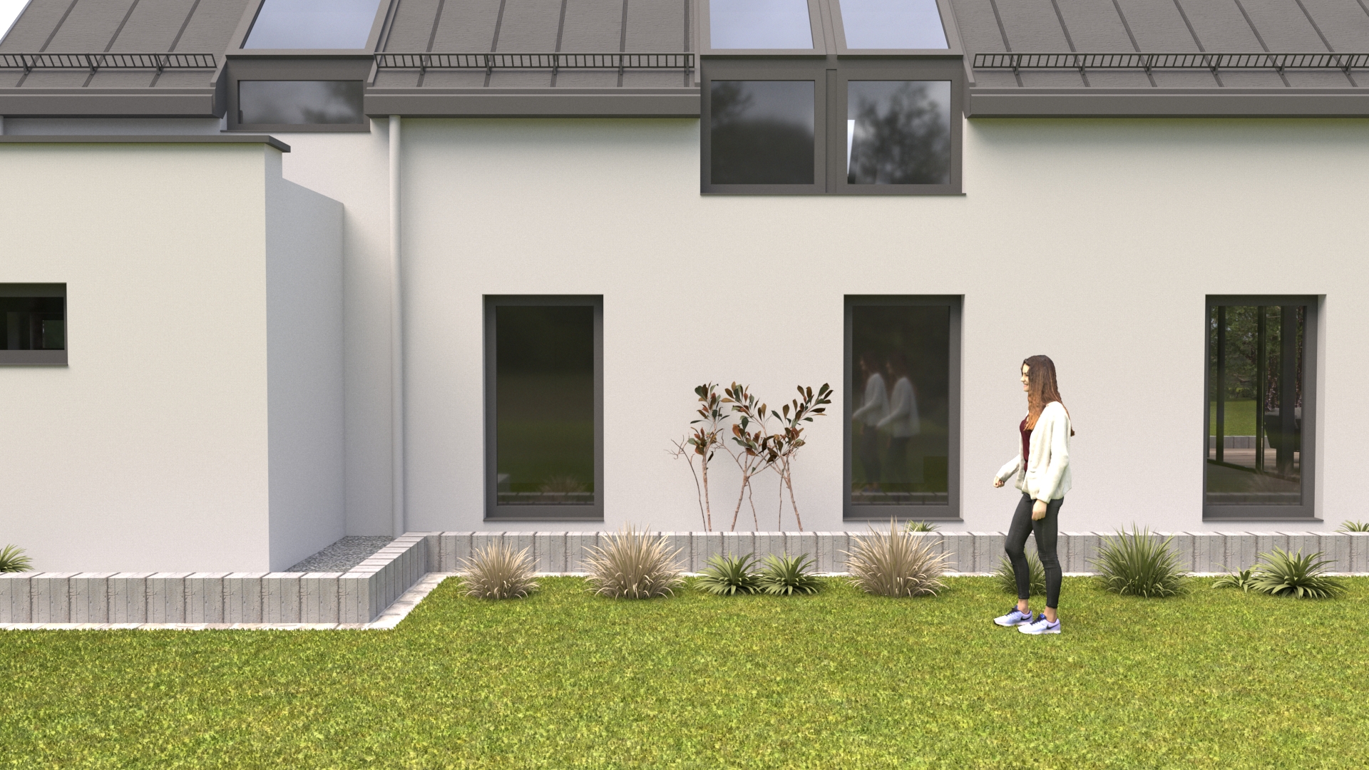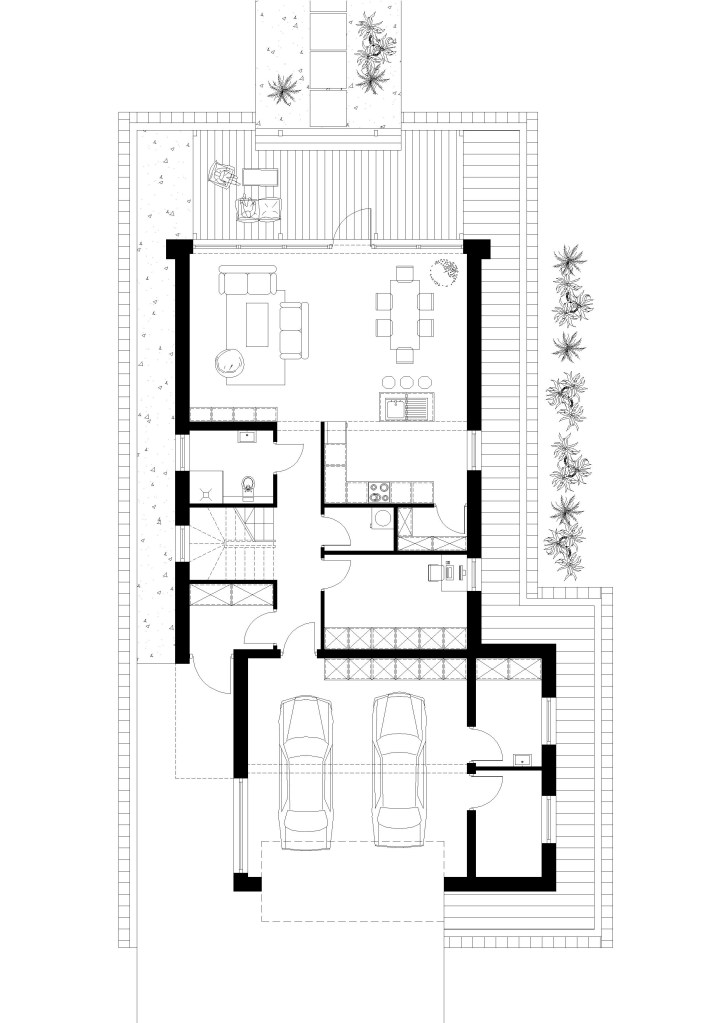 Przestrzeń w parterze została zaprojektowana tak, aby część dzienna była dużą przestrzenią stanowiącą oazę spokoju dla domowników. Jest to idealne miejsce dla każdego, kto ceni sobie ciszę i własną przestrzeń jak i dla osób prowadzących własną działalność, gdyż w parterze istnieje możliwość wydzielenia części gabinetowej od części dziennej. Przestrzenny salon połączony jest z zadaszonym i zapraszającym do ogrodu tarasem.