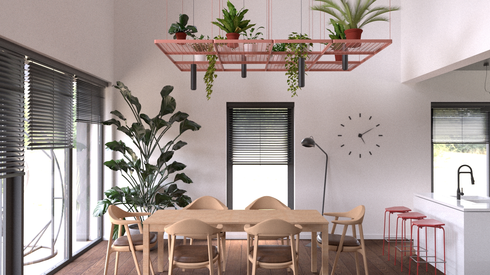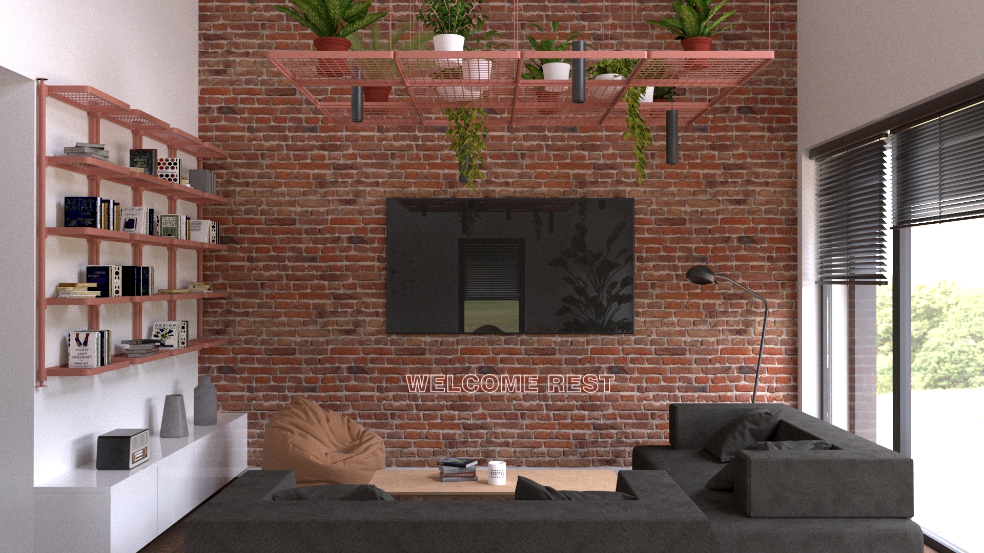 Ogromne wnętrze do zagospodarowania, w którym dobrze było wykorzystać jego wielkość nie tylko w poziomie, ale również w pionie, stąd powstał pomysł na zieleń na ramach przytwierdzonych do sufitu. Kwiaty dodają przestrzeni domowego klimatu, a rama w kolorze łososiowym nawiązuje do głównej ściany pomieszczenia udekorowanej cegłą. Dodanie elementów takich jak rośliny na podwieszanych doniczkach czy wiszące ogrody, sprawia, że przestrzeń nabiera nowego wymiaru i staje się bardziej przyjazna oraz interesująca. To świetny sposób, aby wykorzystać przestrzeń do góry, a także wprowadzić naturalne elementy do wnętrza, tworząc harmonijną i oryginalną aranżację. Umieszczenie roślin na wysokości także pozwala zaoszczędzić miejsce na podłodze, co może być szczególnie przydatne w przypadku dużych przestrzeni mieszkalnych.