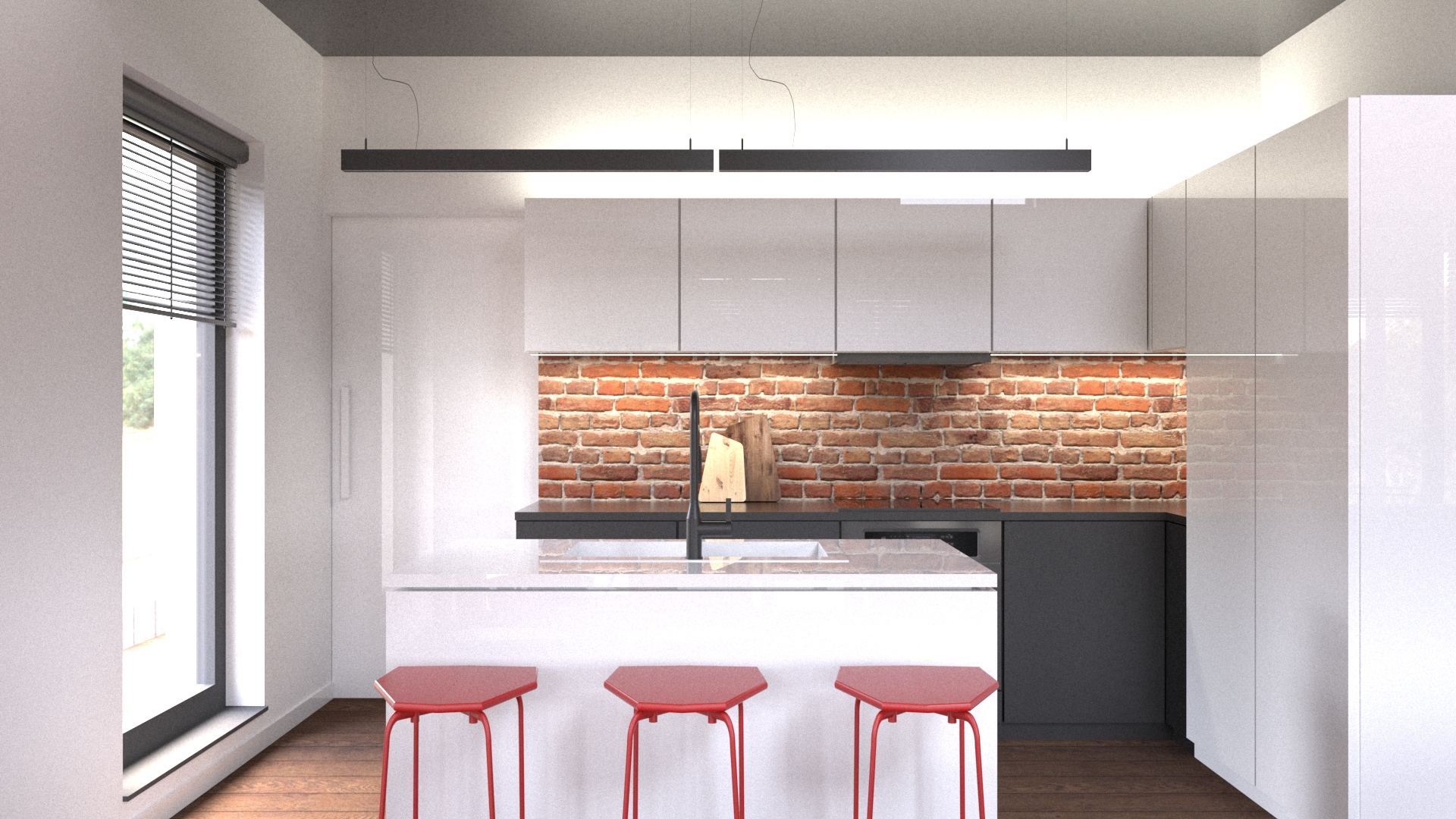 Nad stołem jadalnianym goszczą kwiaty tak piękne, że nawet zazdrosne byłyby obrazy w ramach. Harmonia między jadalnią a salonem to prawdziwy hit! A kuchnia? No cóż, ona jest jak dżentelmeńska umowa – minimalistyczna, z subtelnym czerwonym pazurkiem i ściankami niczym ceglany mur pomiędzy zakochanymi meblami.